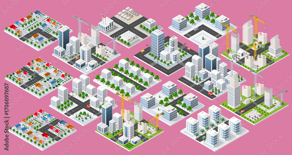 Obraz na płótnie Canvas - Set of isometric city with snowy streets and buildings under construction.