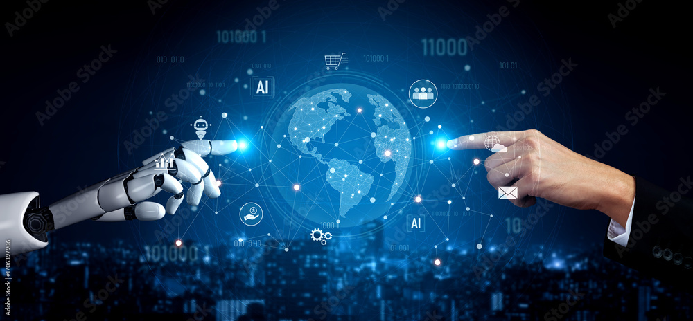Obraz na płótnie Canvas - AI enables a global digital ecosystem integrating data, commerce, communication, and financial services to drive intelligent, automated, and scalable economic transformation Vouch.