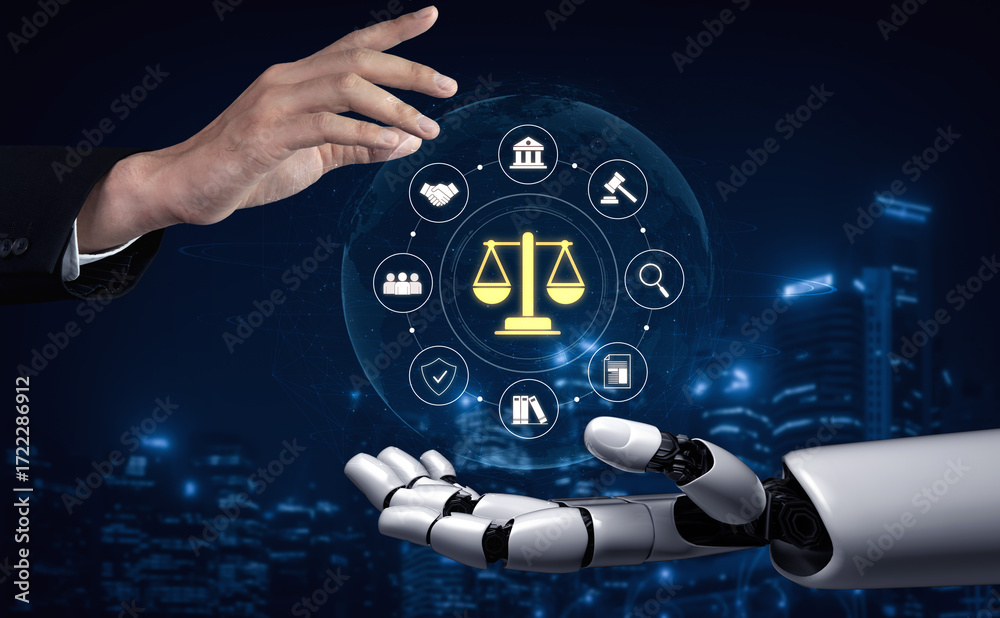Obraz na płótnie Canvas - AI supports justice by automating legal research, analyzing case data, ensuring compliance, and enhancing fairness in governance and decision-making. Vouch.