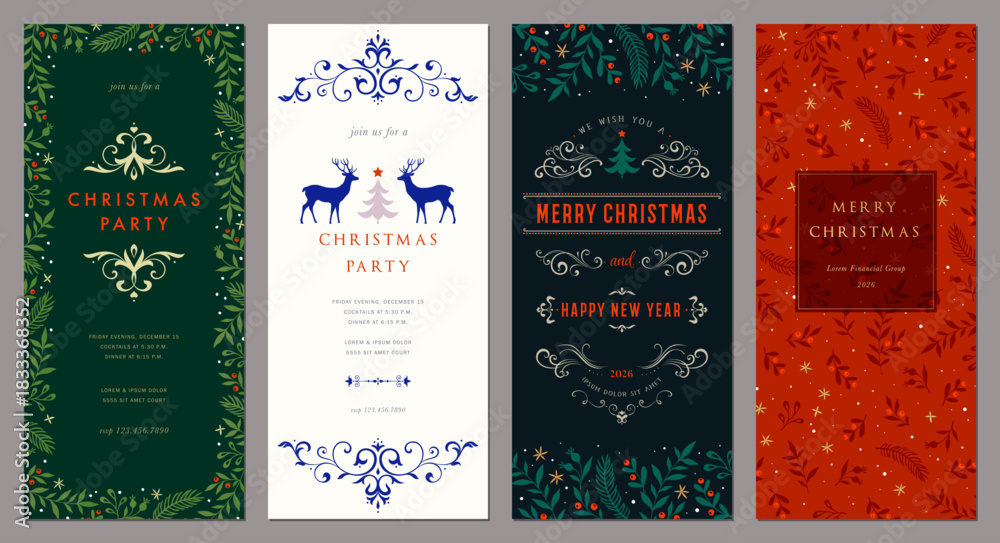 Obraz na płótnie Canvas - Winter Holiday cards. Abstract Christmas tall templates 4x9 with decorative Christmas Tree, reindeers, ornate floral background and frame with copy space and greetings..