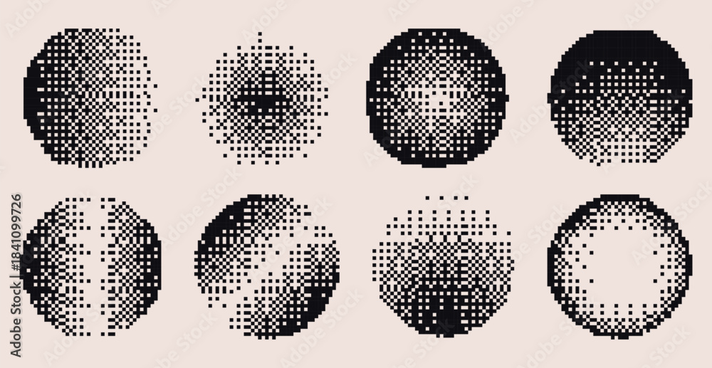 Obraz na płótnie Canvas - Round halftone gradient shapes set isolated on background. Vector illustration of abstract circles with black dot texture, grainy dither effect, 8-bit arcade game planet design, grunge poster element.