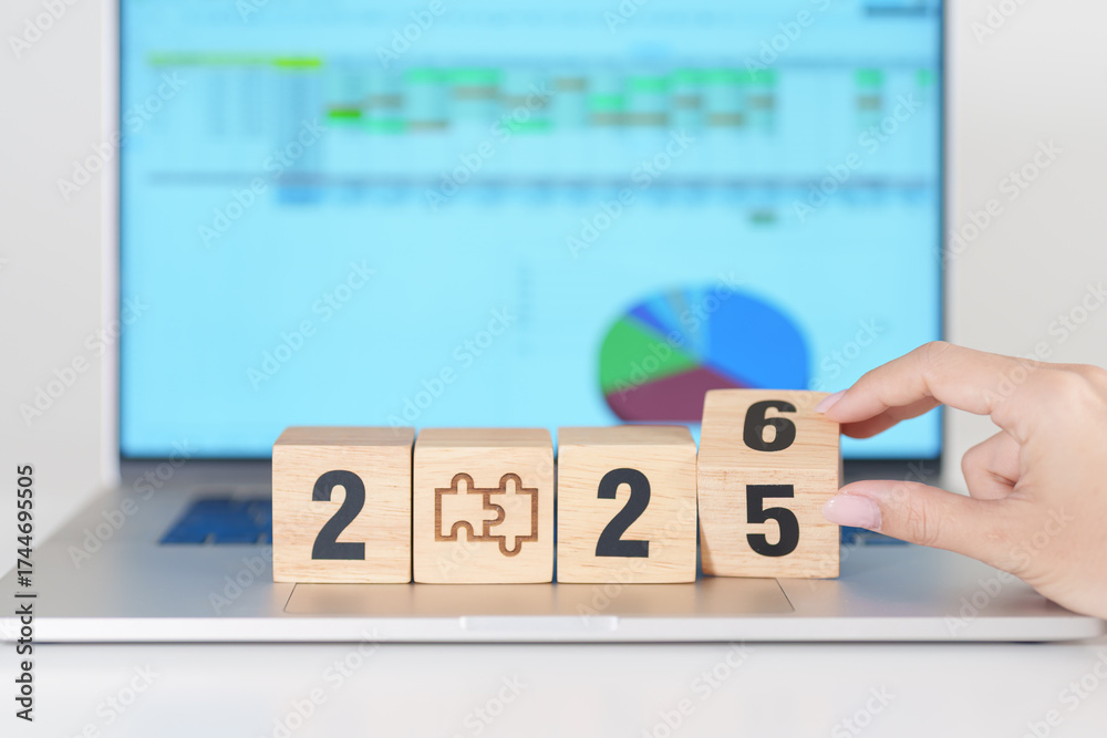 Obraz na płótnie Canvas - 2025 end year to Happy New Year 2026 block with jigsaw puzzle icon against laptop computer. Business Process, Team, teamwork, Goal, mission, Resolution, strategy, plan, Action and partnership.