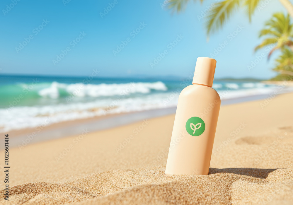 Obraz na płótnie Canvas - Cosmetic bottle is standing on the sand with ocean waves crashing in the background.