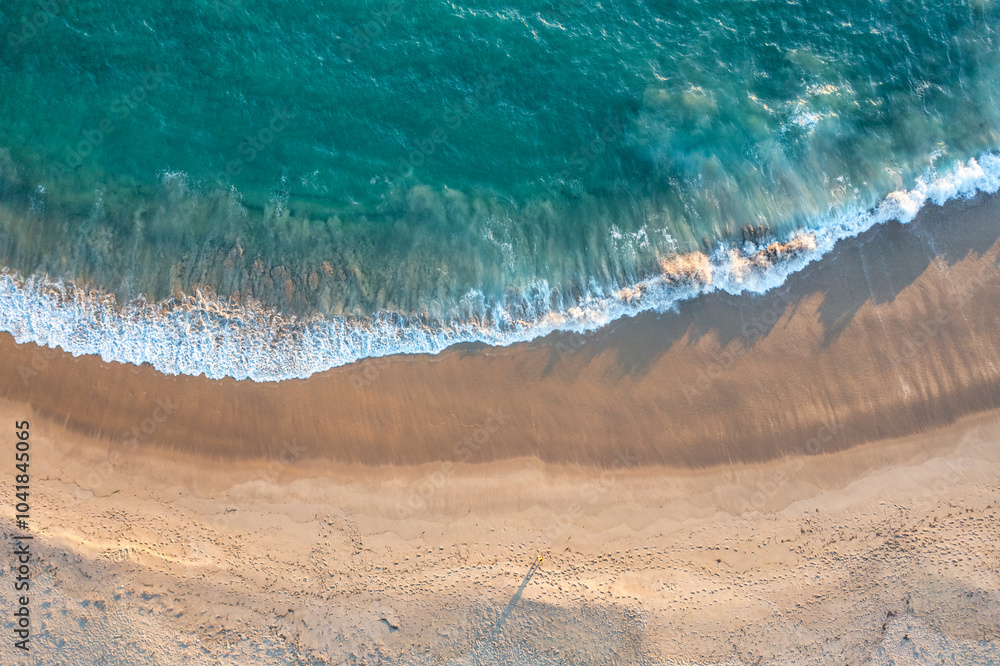 Obraz na płótnie Canvas - Beach sand sea water summer background. Sand beach desert texture. White foam wave sandy seashore top view..