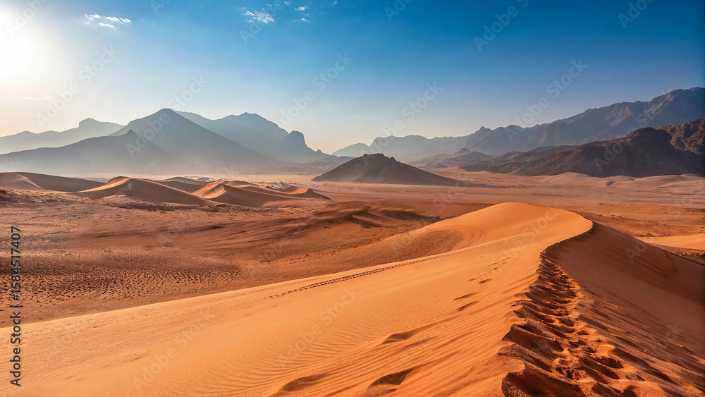 Obraz na płótnie Canvas - Warm Golden sand dunes under sunny day in desert United Arab Emirates. Empty warm sunlight desert .