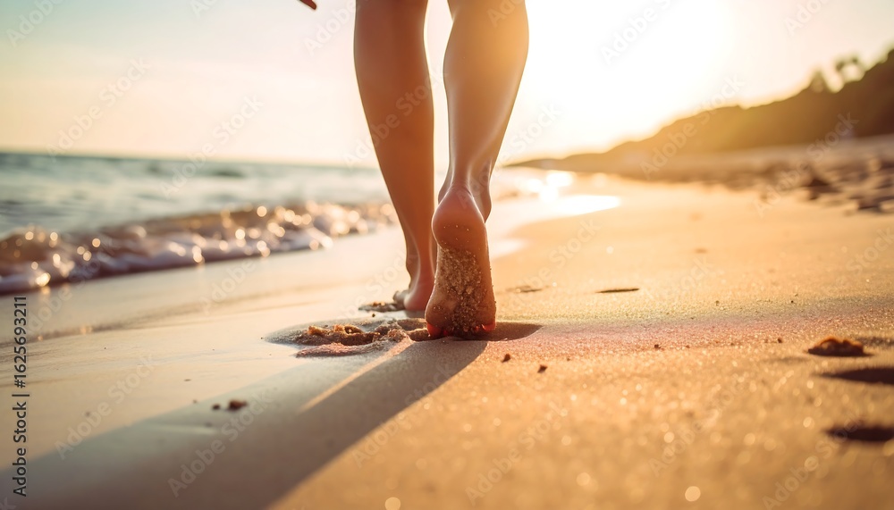Obraz na płótnie Canvas - Woman walking sunset beach sand..