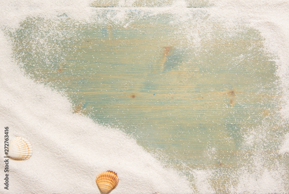 Obraz na płótnie Canvas - White sand and and shells on planked wood. Summer background with copy space and frame for text. Top view.