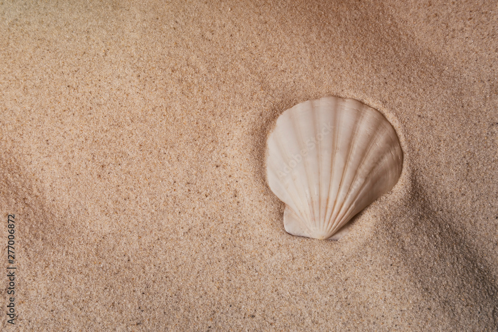 Obraz na płótnie Canvas - Seashell on sand, top view. Sea summer vacation background with copy space..
