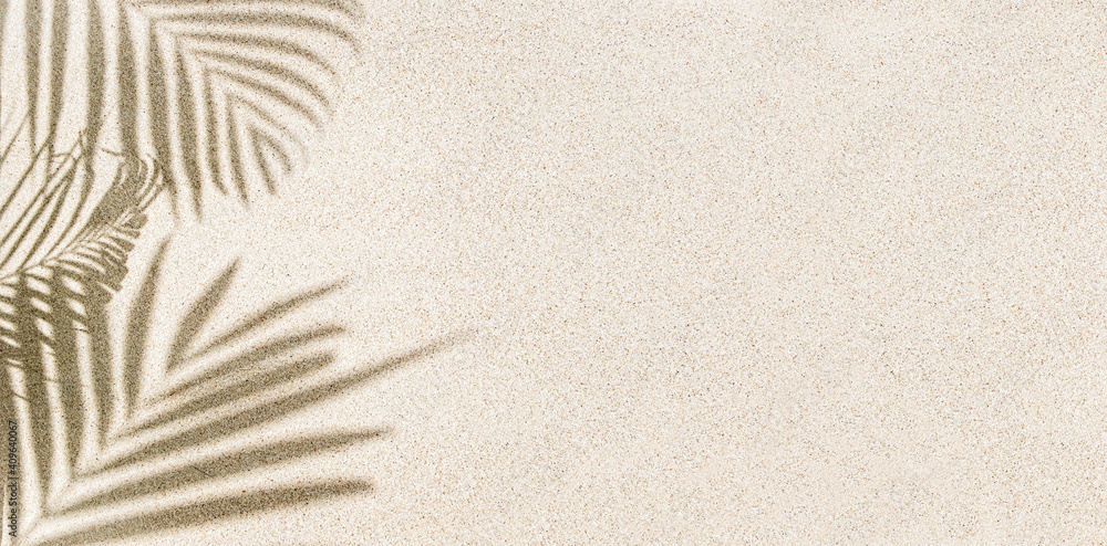Obraz na płótnie Canvas - Banner of Palm leaf shadow on sand, top view, copy space.