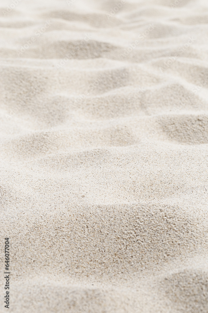 Obraz na płótnie Canvas - Fine Sand texture natural view. Close up of sand on shore sea, white waves dunes, beige neutral color, minimal nature aesthetic vertical photo. Sandy beach for background, selective focus.