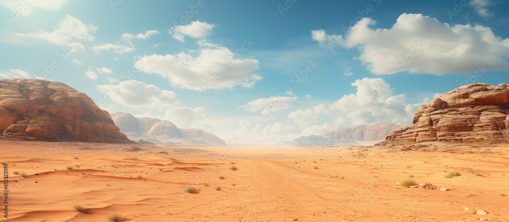 Obraz na płótnie Canvas - The Valley of the Moon in Jordan known as Wadi Rum desert has orange sand haze and clouds It is a UNESCO World Heritage Site and resembles the red planet Mars It is a popular destination fo.
