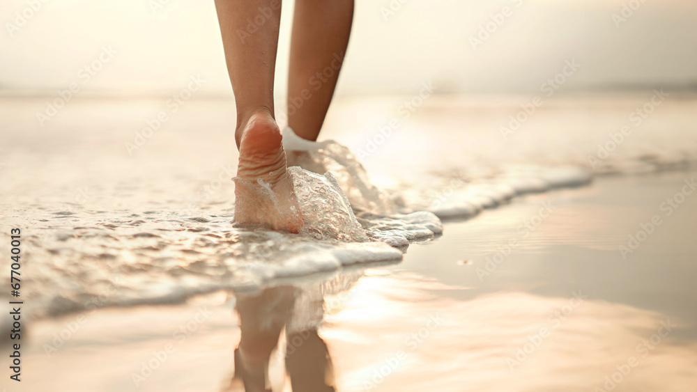 Obraz na płótnie Canvas - Closeup of woman feet walking on sand beach during a golden hour sunset. Travel and relaxing in summer .