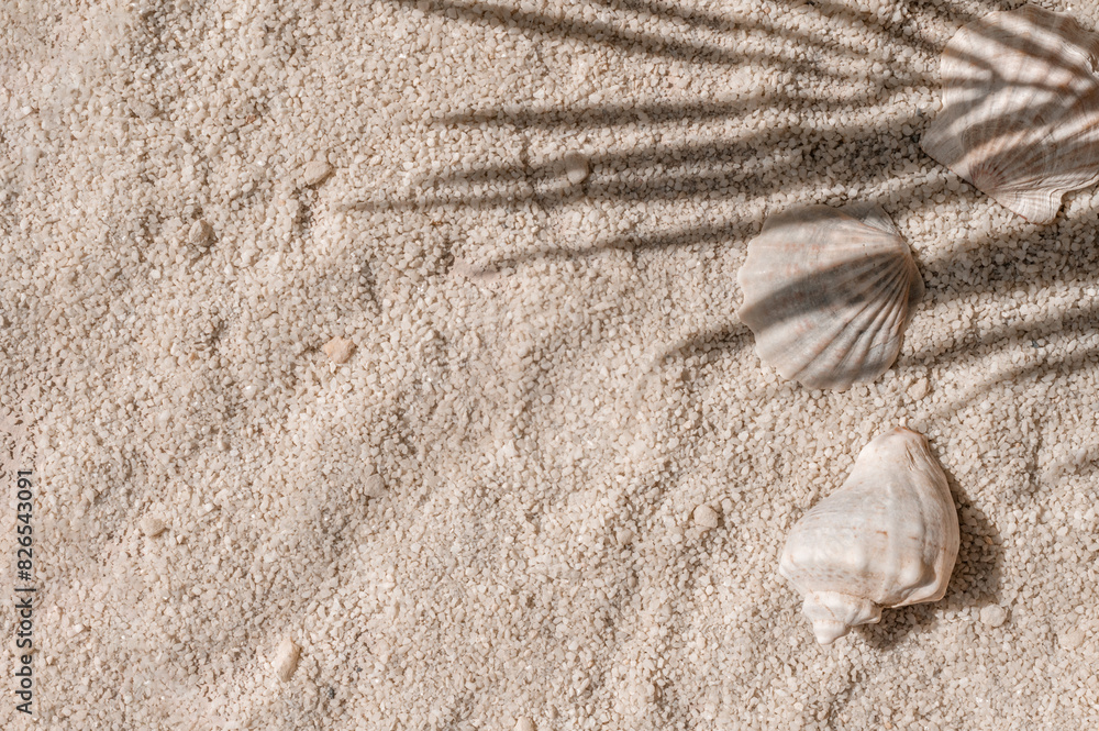 Obraz na płótnie Canvas - Aesthetic natural summer vacation and resort background, beach sand and sea shells with tropical palm tree leaves sunlight shadows.