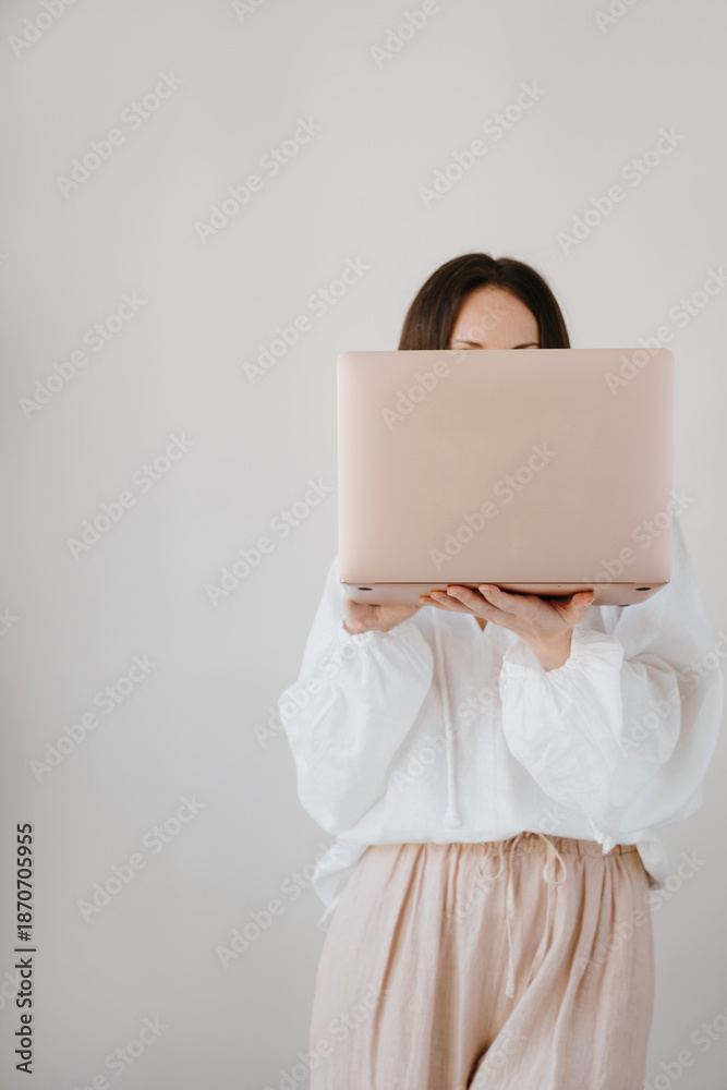 Obraz na płótnie Canvas - Woman in white blouse holding laptop computer covering face with device. Modern technology and remote work lifestyle concept.