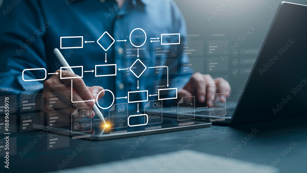 Obraz na płótnie Canvas - Business workflow process and automation system with flowchart, project management, data analysis, business process optimization, Document management system framework, Enterprise content management..