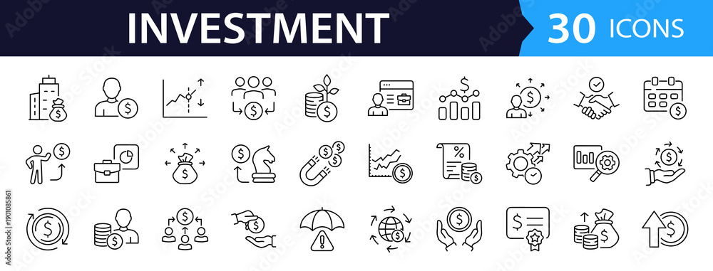 Obraz na płótnie Canvas - Investment Web Icon Set in Linear Style. Collection of finance and money, line icons, including profit, investor, portfolio, asset, management, financial gain, interest and stock. Editable stroke.