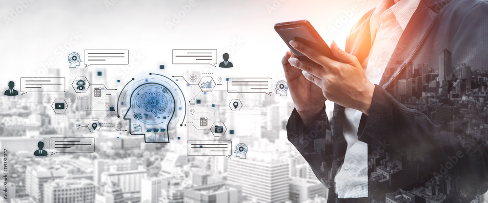 >Obrazy na płótnie Canvas>Wybrane motywy - zobacz więcej !>Pod palmami>Artificial intelligence AI chat message concept linking users, knowledge base, search and analytics to provide automated NLP data support and informed business decisions, tech model training. Corpus