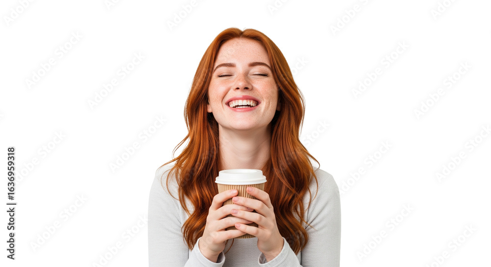 Obraz na płótnie Canvas - Rothaarige Frau – Kaffeebecher halten, transparenter Hintergrund, PNG .