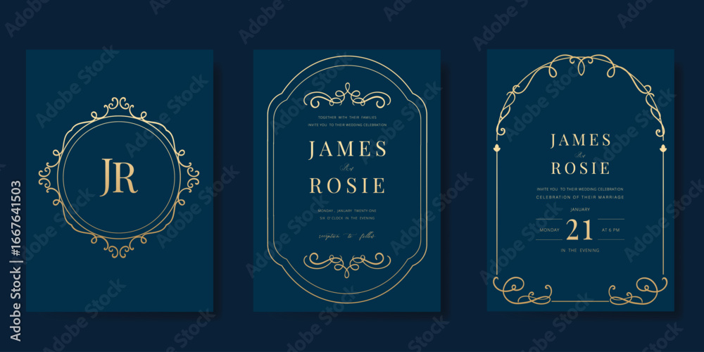 Obraz na płótnie Canvas - Wedding invitation card design vector set. Elegant wedding card with frame antique art deco on navy blue background. Design illustration for cover, poster, gala..