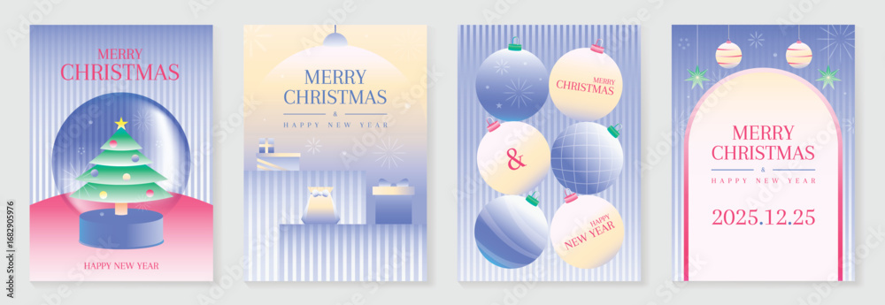 Obraz na płótnie Canvas - Christmas and Happy Holidays poster vector set. Modern new year card template with christmas tree, bauble, gift, snow globe on blue gradient background. Design for cover, website, promotion, ads..