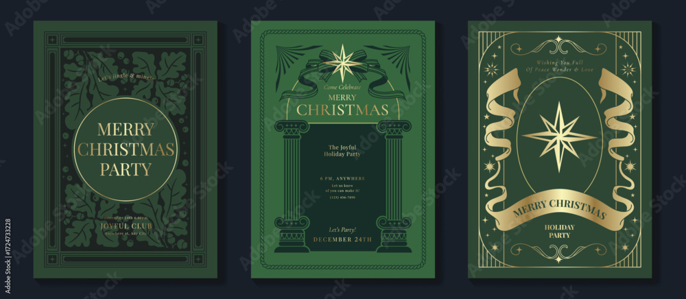 >Obrazy na płótnie Canvas>Wybrane motywy - zobacz więcej !>Polska>Christmas and Happy Holidays poster vector set. Luxury card template with Victoria frame, leaves, ribbon ornament vintage border on green background. Design illustration for cover, poster, packaging.