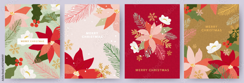 >Obrazy na płótnie Canvas>Wybrane motywy - zobacz więcej !>Polska>Merry Christmas greeting card Set. Modern beautiful Xmas design with hand drawn Poinsettia flowers, holly berries, fir branches, snowflakes pattern and typography. Art banner, poster, cover templates.