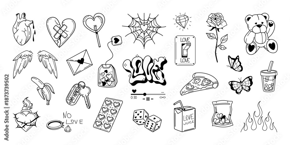 >Obrazy na płótnie Canvas>Wybrane motywy - zobacz więcej !>Polska>Hand Drawn Love Doodle Icon Set in Black and White. Doodle set with love-themed: hearts, wings, rose, teddy bear, butterflies and other. Cute stickers for February 14 is Valentine's Day. Vector set