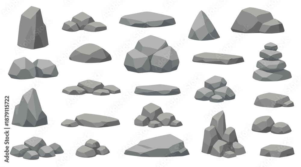 Obraz na płótnie Canvas - Cartoon stone and rock shapes collection. Set of flat vector stones, boulders and rock elements for nature scenes.