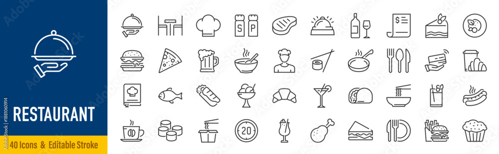 Obraz na płótnie Canvas - Restaurant web icons in line style. Food, meal, fish, delivery, cooking, fast food, collection. Editable stroke. Vector illustration..