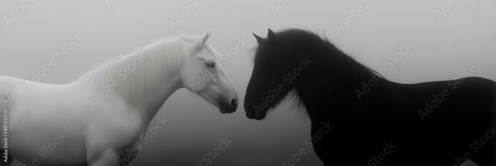 Obraz na płótnie Canvas - Black and white horses connecting in a minimalist concept. Two horses, one white and one black, facing each other on a misty light background.