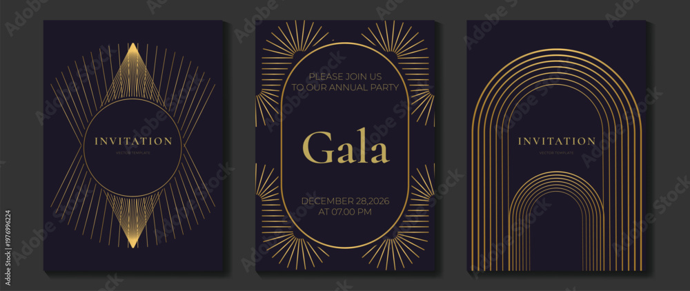 >Obrazy na płótnie Canvas>Wybrane motywy - zobacz więcej !>Polska>Luxury gala invitation card background vector. Golden elegant gradient gold line pattern on black and light background. Premium design illustration for wedding and vip cover template, grand opening.