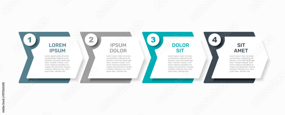Obraz na płótnie Canvas - Four-step horizontal flow chart infographic with sections, icons, placeholder text for business processes. Vector illustration..