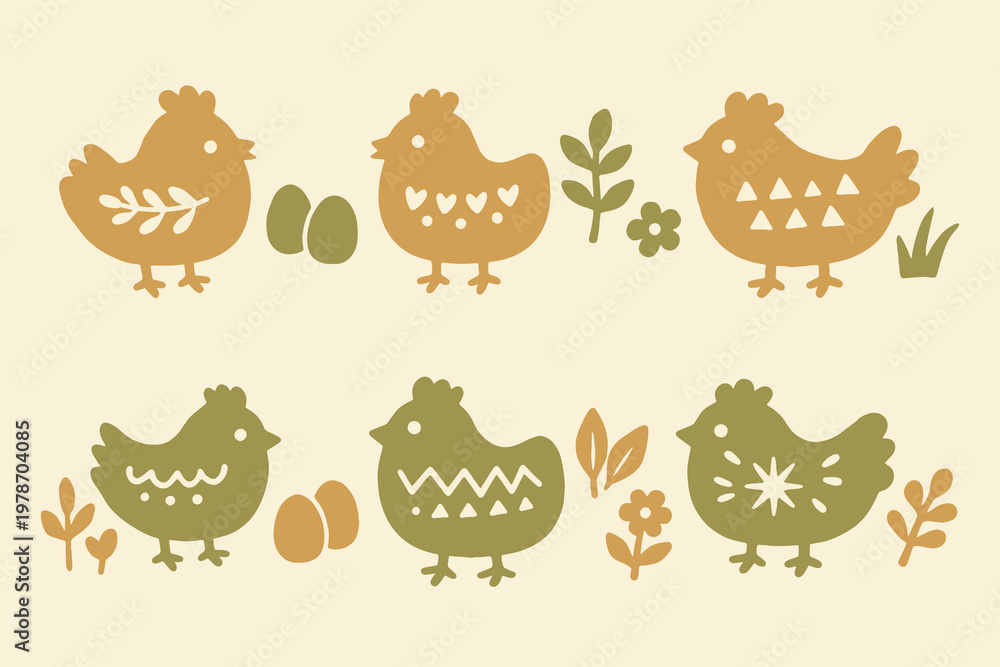 Obraz na płótnie Canvas - Chicken set naive folk vector illustration.