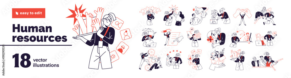 >Obrazy na płótnie Canvas>Wybrane motywy - zobacz więcej !>Polska>Human resources concept set. Sketches of HR. Searching for candidates, reviewing of CV, job interviews, recruitment and onboarding. Employee hiring. Flat isolated outline vector illustrations on white