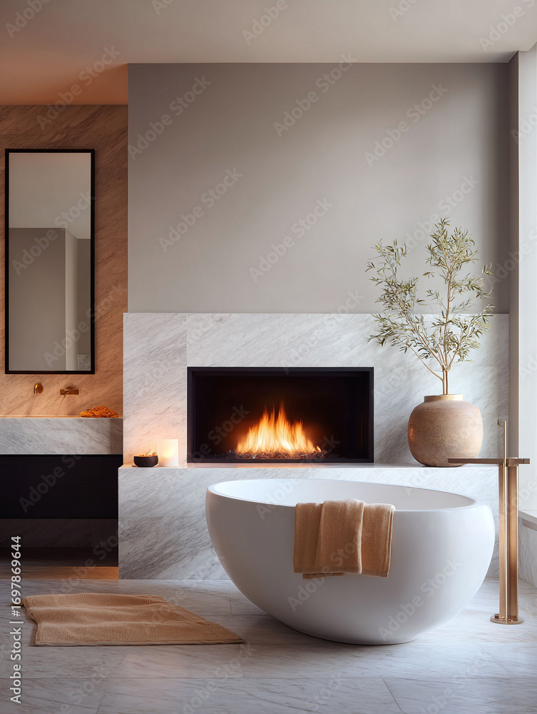 Obraz na płótnie Canvas - Serene bathroom featuring a modern tub and fireplace, conveying relaxation and luxury. Ideal for showcasing home design, wellness, and aspirational lifestyle..