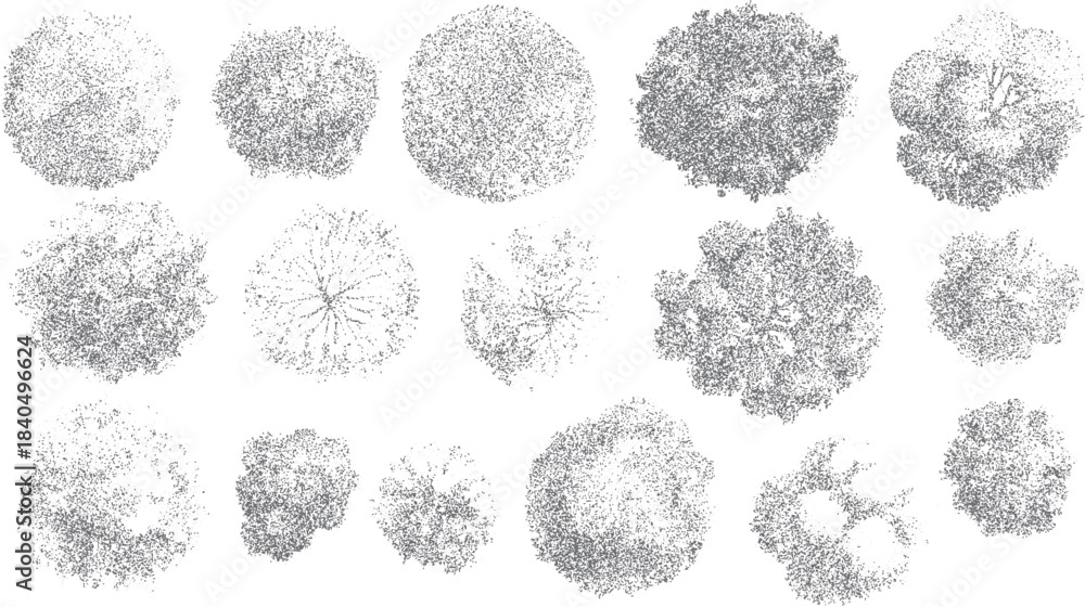 Obraz na płótnie Canvas - Fifteen top down view illustrations of various trees rendered in grey stippling on a white background.