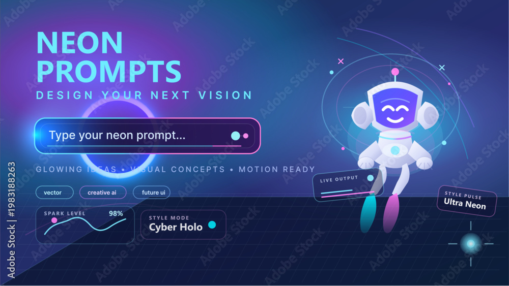 Obraz na płótnie Canvas - Futuristic neon prompt interface with robot assistant and glowing UI elements on dark gradient web banner.