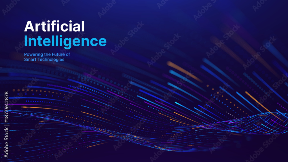 Obraz na płótnie Canvas - Big Data Flow Particles Dots. Digital Neural Network. Concept of AI Artificial Intelligence Technology Machine Deep Learning. Digital Communication. Scientific Research Presentation Vector..