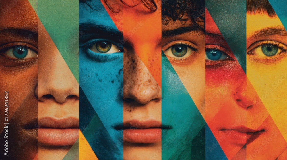 Obraz na płótnie Canvas - Diverse Group of Young People With Unique Features and Colorful Background Displaying Different Emotions in a Creative Art Representation.
