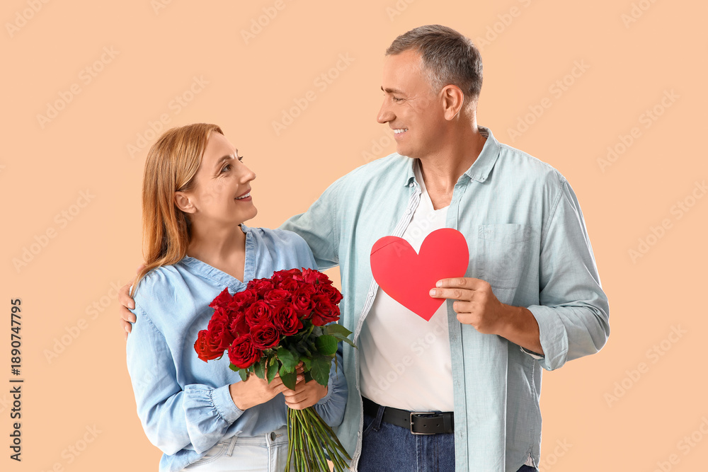 Obraz na płótnie Canvas - Happy mature couple with bouquet of roses and paper heart on beige background. Valentine's Day celebration.