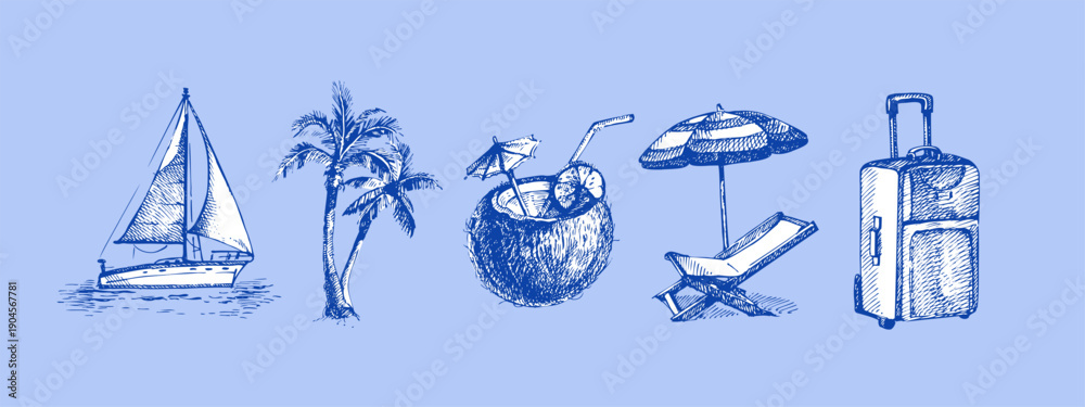 Obraz na płótnie Canvas - Vintage summer coastal set. Retro sketch beach vacation stickers. Hand drawn vector illustration..