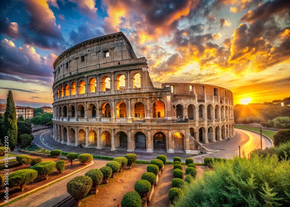 Obraz na płótnie Canvas - Captivating Urban Exploration Photography of the Colosseo: A Wide Perspective Showcasing Ancient Architecture, Rich History, and Vibrant Atmosphere in Rome's Iconic Landmark.