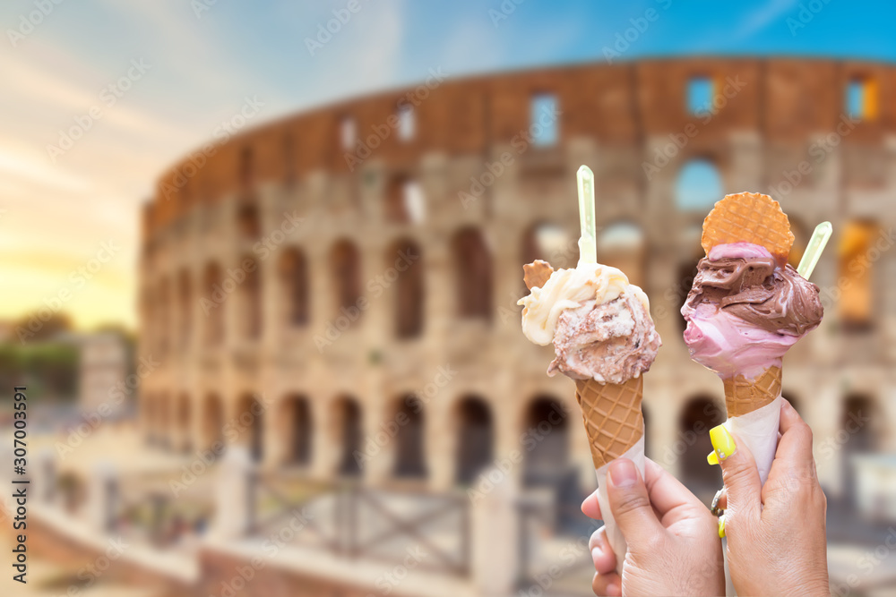 Obraz na płótnie Canvas - Colosseum at sunset in Rome, Italy with italian ice cream gelato in hands. World famous landmark in Italy.