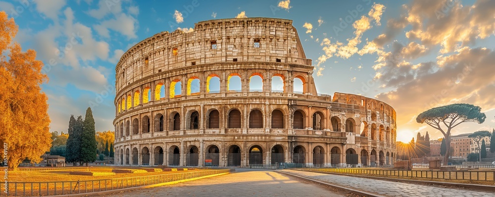 Obraz na płótnie Canvas - A wide panoramic shot that captures the full circle of the Colosseum against a dramatic sky at sunrise or sunset.