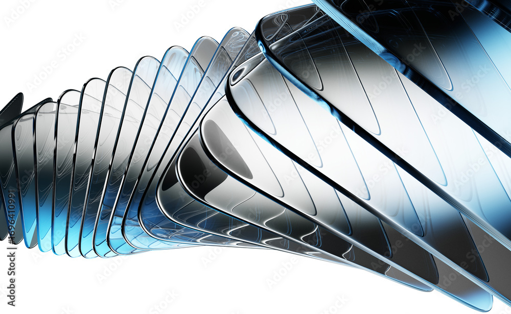 Obraz na płótnie Canvas - Abstract black 3d background with row of glass transparent square plate shapes render. Futuristic speed design digital tech network bg. Crystal data array with light blue gradient.