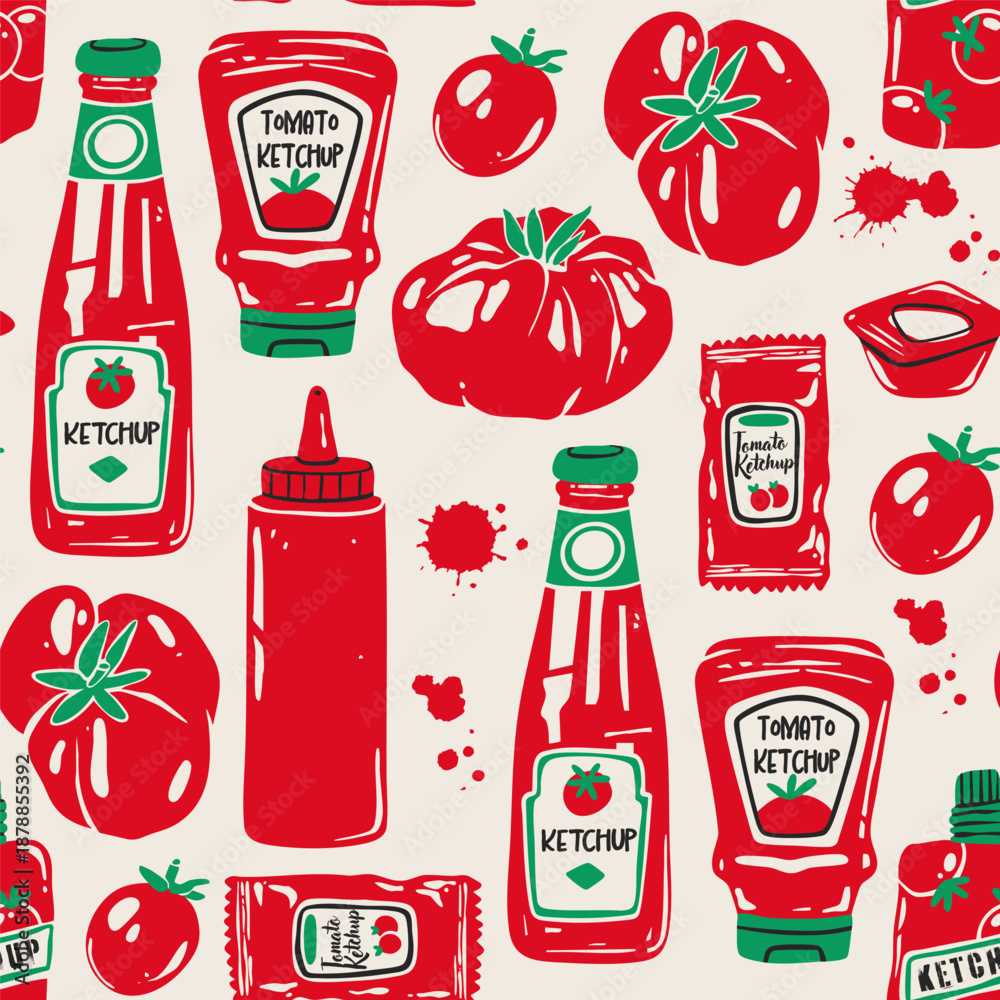 Obraz na płótnie Canvas - Various Ketchup sauces in bottles, tomatoes. Different container shapes. Plastic, squeeze, glass bottles, soft package, small bag, sauce cup. Hand drawn Vector illustration. Square seamless Pattern.