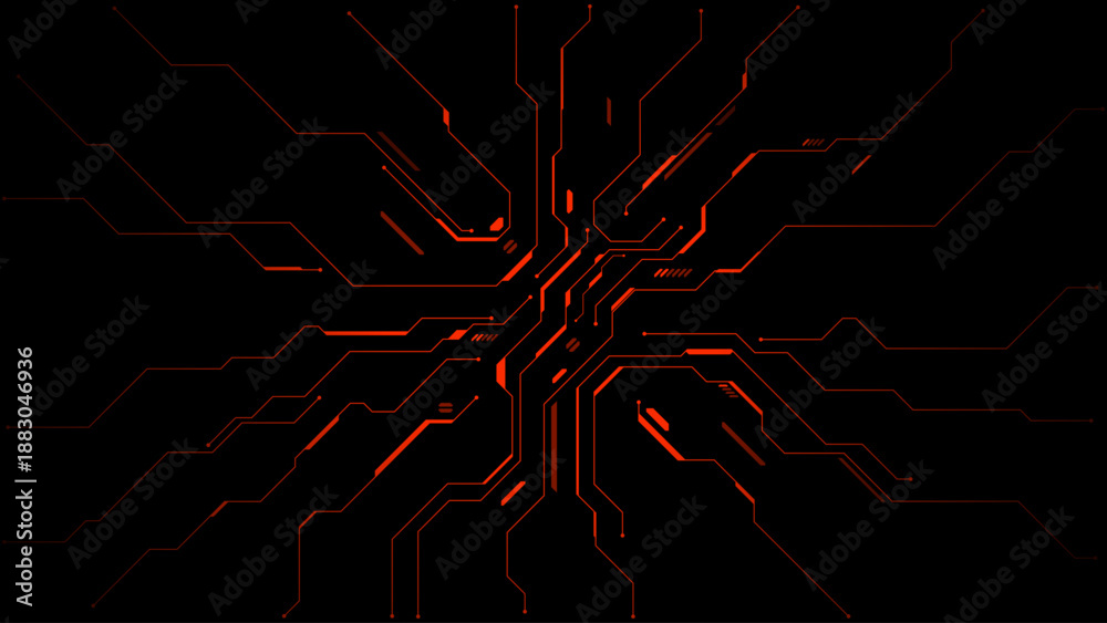 Obraz na płótnie Canvas - Glowing red electronic pathways on dark background. Futuristic digital network with bright lines, abstract technology pattern for cyber concepts and modern graphic designs. Digital vector background..