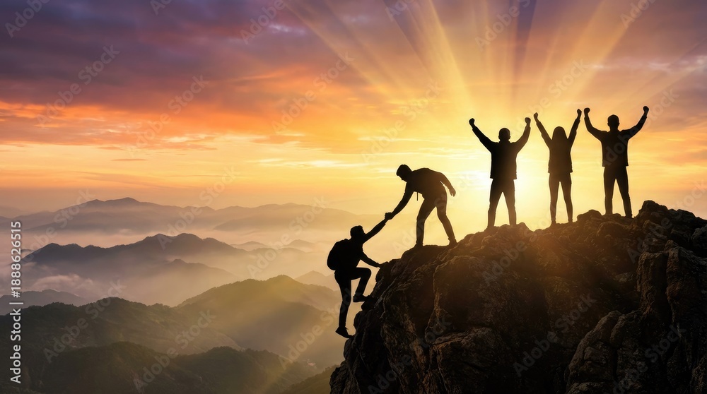 Obraz na płótnie Canvas - Silhouettes of triumphant people on a mountain peak with arms raised at sunrise summit.