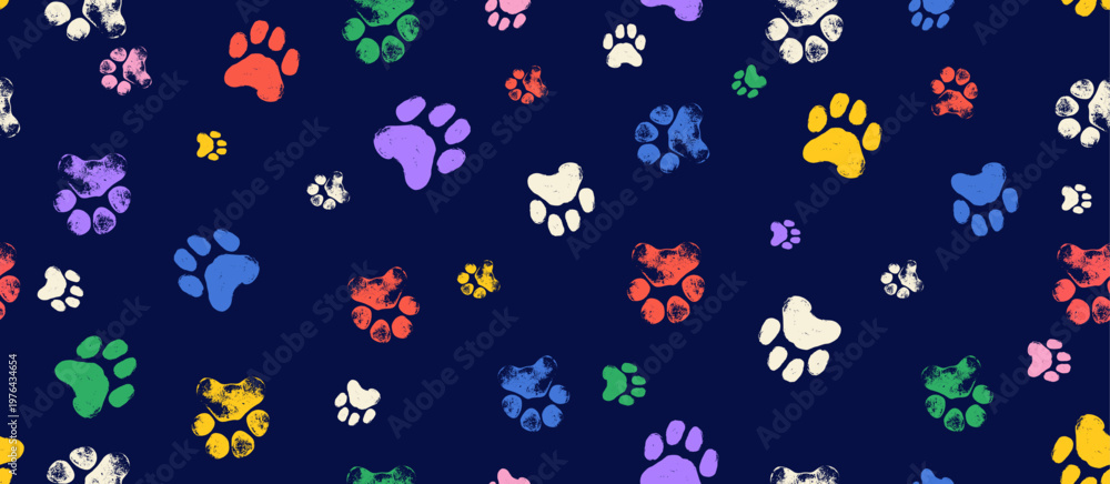 Obraz na płótnie Canvas - Colored seamless pattern of footstep cat paws, cat, dog foot, animal. Animal step texture. Bear, panda, tiger grunge stamp repeat foot track wallpaper. Cartoon monochrome paw print seamless pattern..