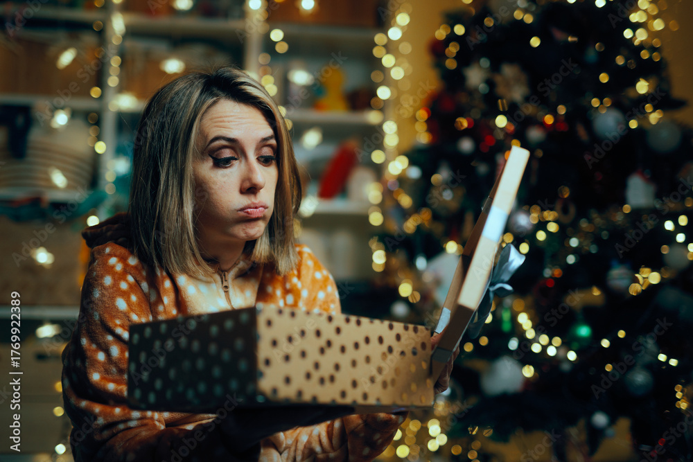 Obraz na płótnie Canvas - Sad Woman Opening the Lid of a Christmas Present Box. Unhappy lady feeling disappointment after opening her gift .